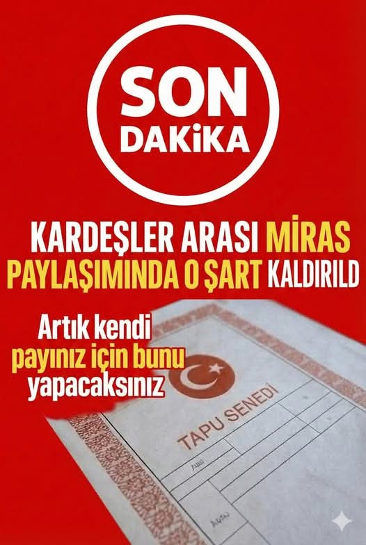 AYRINTILAR �� Y.ORUMDA��Kardeşler arası miras paylaşımında o koşul kaldırıldı! Kendi payınız amacıyla bundan sonra bunu yapacaksınız.Artık kardeşler arasında miras paylaşımı yazılı olarak yapabilir ve karşılıklı olarak imzalandığında geçerli olacak. Bu yeni düzenlemeyle birlikte, Üsteki Resi’mden Diğer Sayfaya Geçiş Yaparak Haberin Devamını Okuyabilirsiniz.