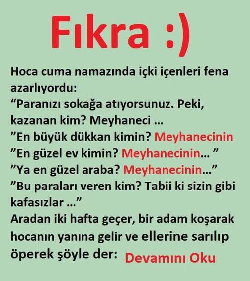 Hoca cuma namazında içki içenleri fena azarlıyordu: “Paranızı sokağa atıyorsunuz. Peki, kazanan kim? Meyhaneci …” ”En büyük dükkan kimin? Meyhanecinin… ” ”En güzel ev kimin? Meyhanecinin… ” ”Ya en güzel araba? Meyhanecinin…” ”Bu paraları veren kim? Tabii ki sizin gibi kafasızlar …” Aradan iki hafta geçer, bir adam koşarak hocanın yanına gelir ve ellerine sarılıp öperek şöyle der: Haberin devamını okumak için sonraki sayfaya geçiniz…