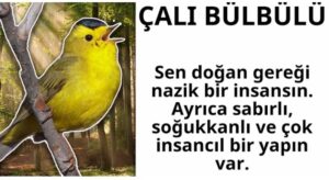 NİSAN Senin doğum kuşun “çalıbülbülü” Sen doğan gereği nazik bir insansın. Ayrıca sabırlı, soğukkanlı ve çok insancıl bir yapın var. Sen mantığından çok duygularınla hareket edersin. Dayanıklılık ve sabır ise senin başarının temelini oluşturur. Değişime çok açık olduğun söylenemez. Bir karar alırken enlemesine boylamasına iyice düşünürsün, aldıktan sonra ise kimse seni tutamaz. Şimdi sonucunu arkadaşlarınla paylaş