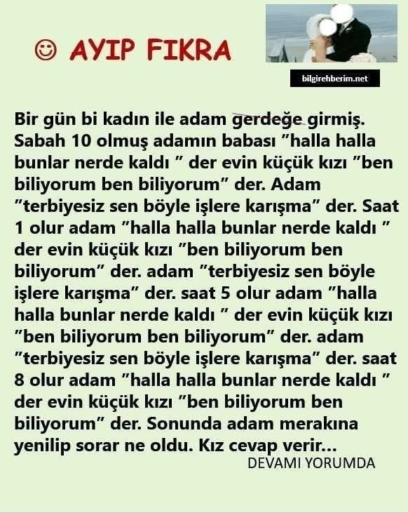 bir gün bi kadın ile adam g.rdeğe girmiş.sabah 8 olmuş adamın babası ”halla halla bunlar nerde kaldı ” der evin küçük kızı ”ben biliyorum ben biliyorum” der.adam ”terbiyesiz sen böyle işlere karışma”der.saat 1 olur adam”halla halla bunlar nerde kaldı bir gün bi kadın ile adam g.rdeğe girmiş.sabah 8 olmuş adamın babası ”halla halla bunlar nerde kaldı ” der evin küçük kızı ”ben biliyorum ben biliyorum” der.adam ”terbiyesiz sen böyle işlere karışma”der.saat 1 olur adam”halla halla bunlar nerde kaldı