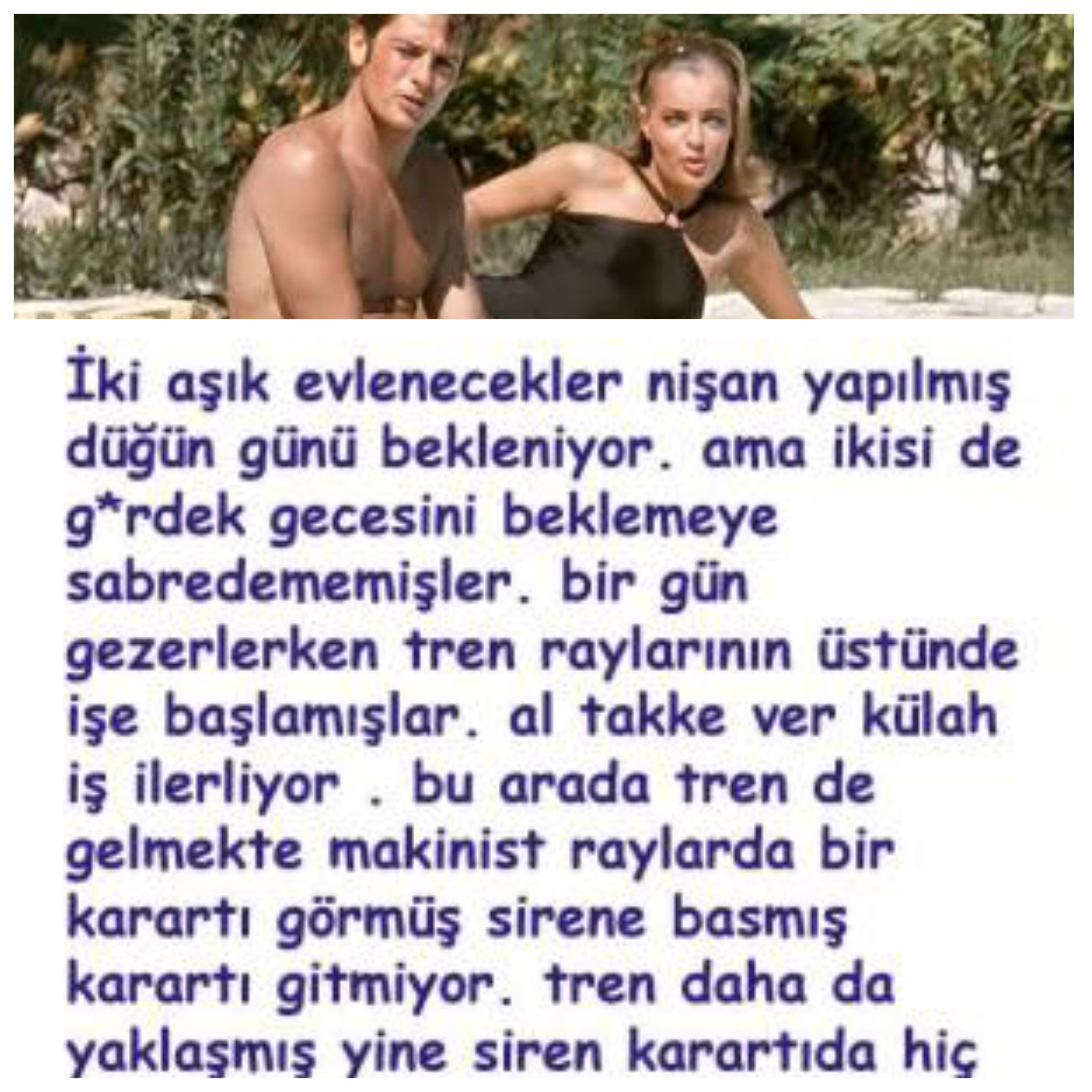 İki aşık evlenecekler nişan yapılmış düğün günü bekleniyor. ama ikiside g*rdek gecesini beklemeye sabredememişler. bir gün gezerlerken tren raylarının üstünde işe başlamışlar. al takke ver külah iş ilerliyor . bu arada tren de gelmekte makinist raylarda bir karartı görmüş sirene basmış karartı gitmiyor. tren daha da yaklaşmış yine siren karartıda hiç bir tepki yok en sonunda makinist..